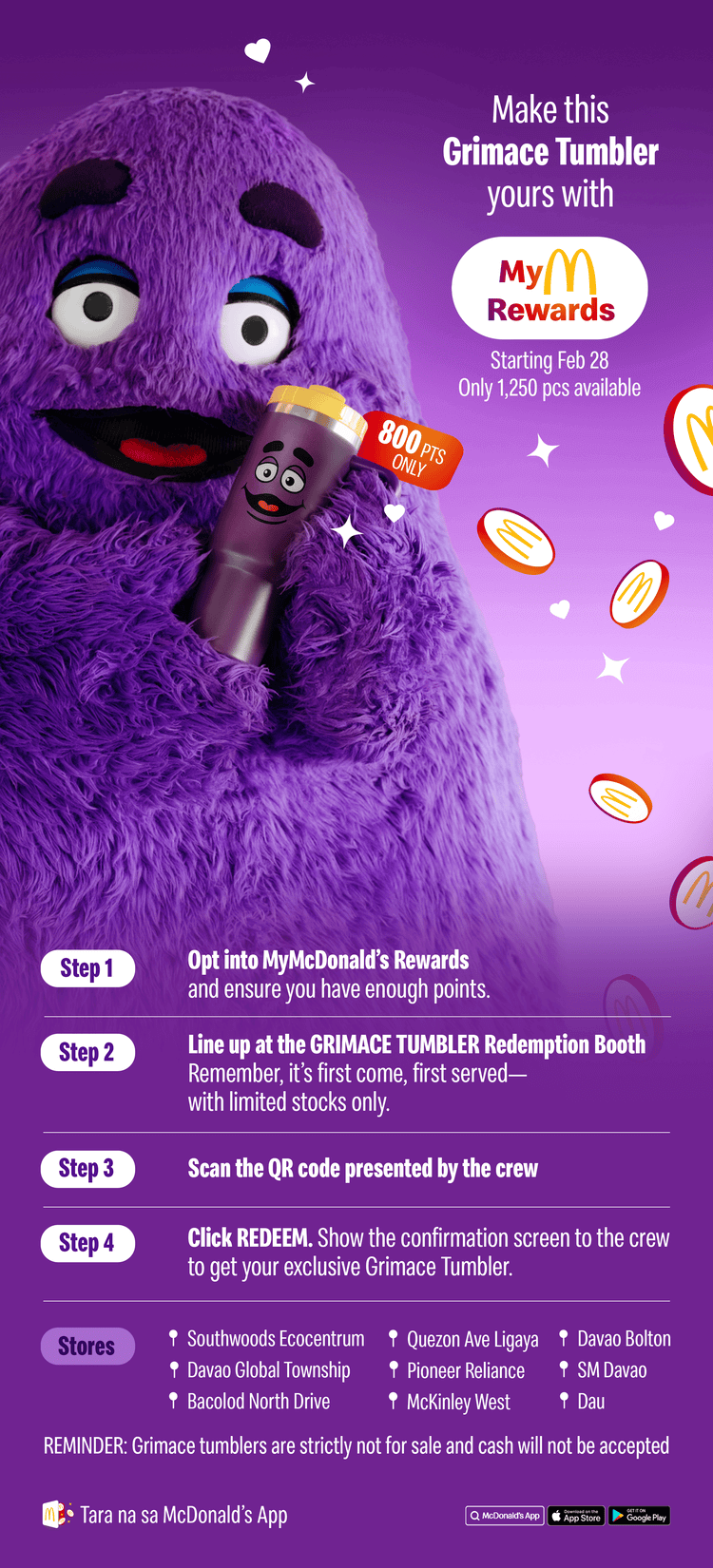 Grimace tumbler he/she is interested in claiming at any of the participating stores starting February 28, 2026. - Upon scanning, the customer will be redirected to the Grimace Tumbler landing page